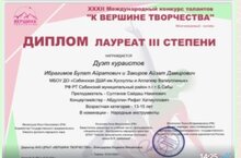 В номинации Инструментальное исполнительство "Фортепиано-соло" Мухамадиева Марьям, Хуснутдинова Динара и "Фортепианный ансамбль" удостоены Дипломов Лауреата 2степени (рук. Яхина Г.И.).