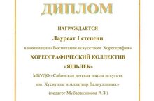 Хореографический коллектив "Яшьлек" МБОУ ДО "САБИНСКАЯ ДШИ ИМЕНИ ХУСНУЛЛЫ И АЛЛАГИЯР ВАЛИУЛЛИНЫХ" (руководитель Мубаракзянова А. З.) заочно принял участие в Республиканском Фестиваль- конкурсе " Браво - 2024. Педагог - инженер человеческих душ", посвященный году инженера в Российской Федерации. В номинации "Воспитание искусством. Хореография." коллектив стал лауреатом 1 степени.