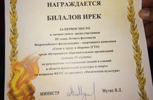 Ученик 9 класса Билалов Ирек занял Первое место в личном зачете среди участников III этапа Летнего фестиваля ГТО по РФ среди обущающихся общеобразовательных организаций (юноши, IV ступень) по результатам тестирования знаний и умений по предмету «Физическая культура»!