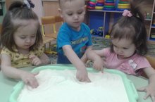 Рисование манкой положительно сказывается на развитии мелкой моторики пальчиков, тактильных ощущений крохи, сенсорики, мышления, фантазии, воображения, речи, мозга малыша. Поэтому мы с воспитанниками 2 группы раннего возраста часто рисуем манкой или занимаемся манкографией, кому как больше нравится это называть. А рисовать можно все, что нравиться - точечки, волнышки, палочки, кружочки ...
