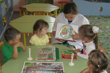 Дети второй группы раннего возраста занимаются с педагогом-психологом Нигматуллиной Ландыш Канифовной. Цель занятия: создание положительного эмоционального настроя в группе, развитие умения действовать соответственно правилам игры, развитие координации движений, общей и мелкой моторики, ориентации в собственном теле, зрительного восприятия (цвета, формы, размера предметов), внимание, речи и воображения.