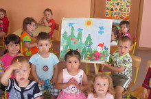 Коллективная работа по аппликации детей второй младшей группы №1 на тему "Лесная полянка для Гномика". 21.06.2013 "Под грибом шалашик- домик. В нем живет веселый гномик". Цель данной работы: вызвать желание у детей заниматься аппликацией, а также закрепить умения пользоваться клеем.
