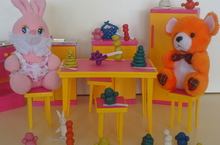 Коллективная работа детей I младшей группы №2 на тему "Подарим игрушки Зайке и Мишке"
