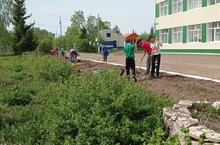 Бүген мәктәп бакчасында укытучылар коллективы чөгендер чәчәргә кереште, территорияне корыган үләннәрдән чистартты.