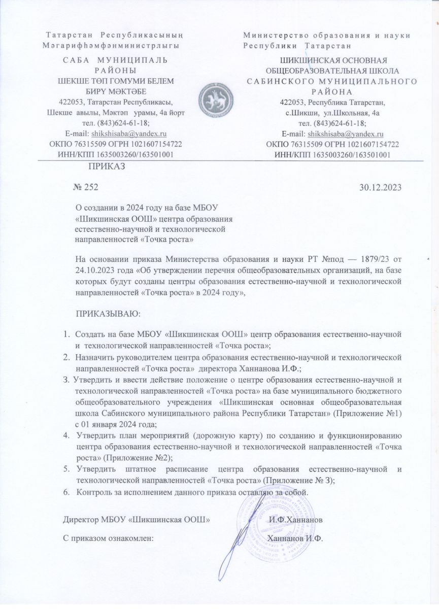 - Приказ от 28.12.2024 г. № под-2368/23 "Об утверждении Комплекса мер ("дорожной карты") по созданию и функционированию в общеобразовательных организациях, расположенных в сельской местности и малых городов Республики Татарстан, центров образований естественно-научной и технологической направленности "Точка роста" в 2024 году"