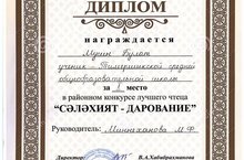 5 нче ноябрь көнне Балалар иҗат үзәгендә район күләмендә уздырылган “ Сәләхият-Дарование”конкурсында безнең мәктәптән 2 укучы катнашты. Кече төркемдә 5 нче сыйныфтан Фатыйхова Миләүшә 3 нче урынга ( җит-се Вәлиева Г.Р.), олылар төркемендә 10 нчы сыйныфтан Мусин Булат 1 нче урынга (җит-се Миннеханова М.Ф.) лаек булдылар. Аларга дипломнар, сертификатлар, истәлекле бүләкләр тапшырылды. Котлыйбыз!