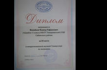 11 нче сыйныф укучысы Фатыйхов Фәннүр К(П)ФУ ның Алабуга шәһәрендәге филиалы тарафыннан үткәрелгән икътисад фәне буенча регионара фәнни Универсиадада 3 нче урынны яулады (җитәкчесе Фазылова Г.Җ.) Котлыйбыз!