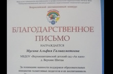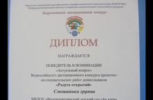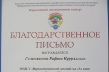 "Мәктәпкәчә яшьтәгеләрнең - ззләнү тәҗрибә проект эше" Бөтенроссия " Радуга открытый" конкурсында без "Экология һәм без" проект эше белән катнашып, " Иң актуаль тема" номинациясендә җиңү яуладык.Катнашкан өчен сертификат һәм җиңүче Дипломына лаек булдык. Балаларның эзләнү сәләтләрен үстерү һәм киңәйтү эшендә актив эш алып барганы өчен тәрбияче Гилемханова Р.Н. ,балаларны һәм педагогны оештырганы өчен бакча мөдире Мусина Ә.Г.лар рәхмәт хатлары белән бүләкләнде.