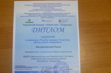 Экологик культура һәм әйләнә - тирә мохитне саклау елы уңаеннан ,Татарстан республикасында оештырылган "Земля моя Татарстан", иҗадый конкурсында катнашып , " Рисунки и плакаты природы Татарстана" номинациясендә Файзрахманова Рамиләбез лауреат дипломына һәм бүләкләргә лаек булды.