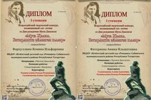 Всероссийский творческий конкурс, посвящённый 120- летию со Дня рождения Мусы Джалиля "Муса Җәлил, Батырлыкка әйләнгән юллар". Воспитанников нашего детского сада Фатхриеву Амину Ильшатовну и Фархуллину Ясмину Ильфаровну наградили дипломами I степени. Желаем успехов.