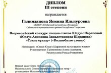 Йолдыз Шәрәпова шигырьләрен сәнгатьле сөйләү буенча бөтенроссия күләмендә узган "Тәмле сүзләр" конкурсында катнашып, Галимҗанова Ясминә Илнур кызы III дәрәҗә диплом белән бүләкләнде. Алга таба да уңышлар телибез!