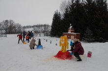 Сегодня кипела работа в школьном дворе: раскрашивали снежные скульптуры. Всё стало красочным, красивым, как в сказке!