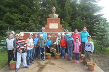 Сегодня в оздоровительном лагере День мужества. После завтрака учитель истории и ОБЖ Мусин И.Х. провел урок Мужества с воспитанниками лагеря. На детей произвели глубокое впечатление кадры из фильмов, рассказ учителя. После урока возложили венки и цветы к обелискам во дворе школы и в селе Завод Нырты. После второго завтрака прошел конкурс чтецов «Моя Родина».