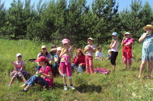Во время экскурсии в березовую рощу провели понравившуюся всем игру "Говорящие вещи". Провели спортивные эстафеты "Кенгуру", "На болоте", "Алфавит".