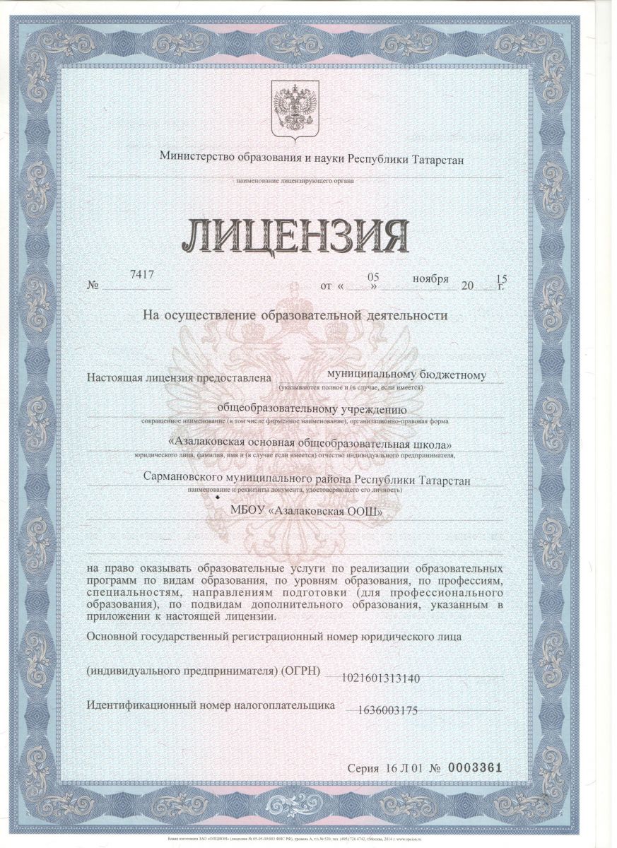 Муниципальное бюджетное общеобразовательное учреждение «Азалаковская основная общеобразовательная школа» Сармановского муниципального района Республики Татарстан / Татарстан Республикасы Сарман муниципаль районы муниципаль бюджет гомуми белем бирү учреждениесе "Азалак төп гомуми белем бирү мәктәбе"