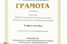 Чатыр Тау ГПКЗ башлыгы Сәрвәров Илнур Әбүзәрович безнең бакчабызда тәрбияләнүче Төхфәтуллин Ниязны һәм тәрбиячебезне, "Мин һәм Кызыл китап"Республика балалар эшләре конкурсында актив катнашкан өчен, Биологик ресурслар буенча ТР Дәүләт комитеты грамоталар һәм истәлекле бүләкләр белән бүләкләде.
