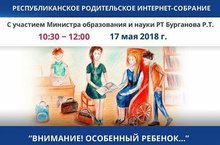 17 мая с 10:30 по 12:00 состоится Республиканское родительское интернет-собрание с участием Министра образования и науки РТ Бурганова Р.Т. "Внимание! Особенный ребенок..." (Об особенностях воспитания и обучения детей с ограниченными возможностями здоровья)