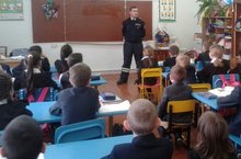 Бүген безнең мәктәптә өлкән дәүләт инспекторы Ахатов Фәнис Фирдәвисович белән очрашу булды. Ул башлангыч класс укучыларына юл йөрү кагыйдәләре турында сөйләде. Безнең авыл юллары буенча төрле сораулар бирде. Балалар барлык сорауларга да җавап биреп, үзләренең юл йөрү кагыйдәләрен төгәл үтәүләрен күрсәттеләр. Фәнис Фирдәвисович һәр бала да тәүлекнең караңгы өлешендә отражатель-яктырткыч тагып йөрергә тиеш икәнлеген тагын кабатлап әйтте.