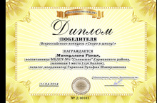 Воспитанники старшей группы приняли участие во Всероссийском конкурсе "Скоро в школу". Дети выполнили конкурсные задания по ФЭМП, по формированию целостной картины мира и т.д.Участники Миннуллина Р. и Гиздатуллина Л. набрали 140-150 баллов.Им выручаны Диплом Победителя Поздравляем!