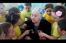 -Балаларга Бөек Ватан сугышы турында таныштырганда без ел саен сугыш ветераны Нәкыя Фарукшинаны очрашуга чакырабыз. Үзе шушы бакчада тәрбияче булып эшләгән Нәкыя апабыз балаларга бик үтемле итеп Җиңү өчен куелган тырышлыклары турында сөйләде.Сугыш афәтен җиңүдә катнашкан Нәкыя апага балалар да осталыкларын күрсәттеләр.