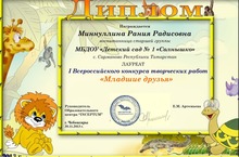 Воспитанники МБДОУ №1"Солнышко" Миннуллина Рания и Ганиева Илюза стали лауреатами I Всероссийского конкурса творческих работ "Младшие друзья".Молодцы!