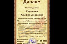 Воспитатель Харисова Альфия Анасовна стала обладателем Диплома за 2 место во Всероссийском конкурсе "Праздник Настоящих мужчин" в номинации "Медиа-творчество". Поздравляем! / Тәрбияче Харисова Әлфия Әнәс кызы Россиякүләм "Чын ир-егетләр бәйрәме" бәйгесенең "Медиа-иҗат" номинациясендә 2 урынга лаек булды һәм Диплом белән бүләкләнде. Котлыйбыз! 11.02.2021