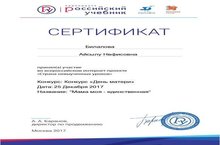 В рамках проекта «Страна невыученных уроков» старший воспитатель нашего детского сада Билалова Айсылу приняла участие во Всероссийском конкурсе методических разработок по внеурочной деятельности на тему «День матери». Она представила методическую разработку «Мама моя – единственная» в электронном виде посредством регистрации на сайте drofa-ventana.ru и получила сертификат участника. 25.12.2017