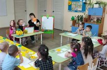 Мәктәпкә әзерлек төркеме балалары "Грамотага өйрәтүгә әзерлек" шөгылендә. Шөгылдә балалар сүзләргә аваз анализы ясау күнекмәләрен ныгыттылар. Сүзнең авазлары составы белән модельнең бәйләнешен күрергә, авазлар составына туры килгән модельны сайлап ала белерге өйрәнделәр.
