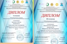 Наши педагоги участвовали во II Республиканском конкурсе "Преемственность поколений.Буыннар бәйләнеше" И были удостоены диплома 1 степени Фасхутдинова Гульфина Алмасовна в номинации "Традиции и обычаи" с воспитанницей Алиуллиной Алией и Зиатдинова Ильгиза Ильгизовна в номинации "Национальные украшения" с воспитанницей Шариповой Дилей, удостоились диплома 3 степени. Поздравляем!/ Буыннар бәйләнеше конкурсында безнең балалар 1 һәм 3 дәрәҗәле дипломнарга лаек булдылар.Котлыйбыз!