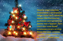 Пусть будет ярким настроениеКак елочные украшения,И радостью искрятся дни,Как новогодние огни!Пускай все лучшее сбывается,Задуманное - получаетсяИ все, чего так сердце ждет,Подарит этот Новый год! -
