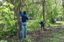 Трудовой отряд очищает школьную территорию от сорняков и засохших деревьев.