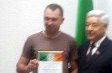 За многолетнюю и плодотворную работу по развитию физической культуры и спорта, волейбола в Республике Татарстан наш учитель по физической культуре Ихсанов Э.Р. получил из рук Ф.Х.Мухаметшина благодарственное письмо.