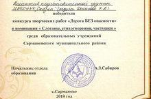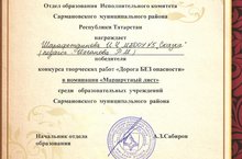 Воспитанник подготовительной группы Шарафетдинов И.Ч. стал победителем в конкурсе творческих работ "Дорога БЕЗ опасности" в номинации "Маршрутный лист". Педагог Иксанова Рамзия Мударисовна