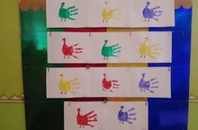 Цель: создание у детей яркого эмоционального отклика на необычный способ создания изображений. Знакомство с возможностью получения образов с помощью отпечатков лалошек. Понимания связи между формой ладошки и очертания изображаемого объекта (птички летят). 1 младшая группа (1). Воспитатель: Фаррахова Э.Р.