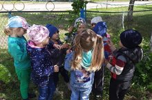 Воспитанники старшей группы с радостью собирают смородину.
