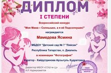 Мамедова Ясмина из старшей группы награждена дипломом 1 степени во Всероссийском конкурсе "МояМама - Солнышко, а я ее Подсолнушек!"