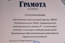 Мәктәпкәчә төркемдә тәрбияләнүче Солтанов Әлфис юл йөрү кагыйдәләре буенча үткәрелгән видеоролик конкурсында катнашып грамота белән бүләкләнде. Аңа алга таба да уңышлар теләп калабыз.