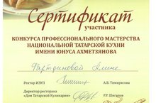 Приготовление блюд татарской кухни определялось по жребию. Наша Елена должна была приготовить следующие блюда: губадия, суп-лапша, десерт «Татлы». Рады вам сообщить, что все приготовленные нашей конкурсанткой блюда, получили высокую оценку. По итогам конкурса Павловой Е. Н. вручен Сертификат. Сертификата была удостоена и Ширеева Г.Р. за профессиональную подготовку конкурсанта. Окончательные итоги данного конкурса будут известны после 10 марта 2016 года. Надеемся, они будут хорошими.