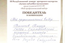 2 марта 2016 года в ГБПОУ «Заинский политехнический колледж» состоялся очный тур III Республиканского конкурса ораторского мастерства «Лучшее публичное выступление» среди студентов ССУЗ Республики Татарстан «Мой профессиональный выбор». Данный конкурс проводится в двух турах. В заочном туре конкурса приняли участие 72 студента из 31 учебного заведения РТ. В очный тур прошли 24 студента. Среди них - студент 51 группы Сармановского аграрного колледжа Вагапов Тимур Робертович. И в очном туре он оправдал наши надежды, достойно представляя Сармановский аграрный колледж. Его выступление «Высота высот пахаря» было удостоено Диплома Победителя по номинации «Мой профессиональный выбор». Каждое публичное выступление было оценено по нескольким критериям: ораторское мастерство, соответствие выступления заданной теме, чёткая формулировка позиции, аргументированное выражение своей позиции широкой аудитории, соблюдение регламента.