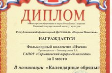 28 ноября состоялся финал этого конкурса. Фольклорный ансамбль «Ихсан» Сармановского аграрного колледжа оказался не только среди финалистов, но и признан одним из лучших. Подготовленный ансамблем календарный обряд «Каурый сибәм су юлына...», удостоен Диплома III степени в номинации «Народно-сценическое искусство».