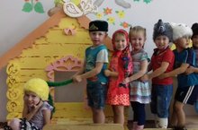 Мышка за кошку, кошка за Жучку, Жучка за внучку, внучка за бабку, бабка за дедку, дедка за репку — тянут-потянут, вытащили репку! В роли артистов дети средней группы.