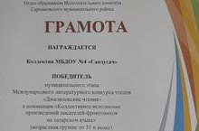Коллектив нашего детского сада стали победителями муниципального этапа Международного литературного конкурса чтецов "Джалиловские чтения" в номинации "Коллективное исполнение произведении писателей-фронтовиков на татарском языке"