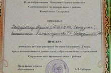 Балалар бакчасына йөрүче Шафигуллина Альзана "Җырлы-моңлы балачак" районкүләм бәйгесендә катнашып "Нәфис сүз" номинациясендә 1нче урынга лаек булды һәм Диплом белән бүләкләнде/ Наши воспитанница Шафигуллина Альзана стала победителем в номинации "Художественное слово" в муниципальном конкурсе "Җырлы-моңлы балачак" 24.04.2019