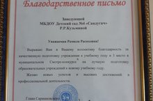 Коллектив нашего детского сада получил "Благодарственное письмо" от главы Сармановского муниципального района Ф.М.Хуснуллина за качественную подготовку учреждения к учебному году и 3 место в смотр-конкурсе на лучшую подготовку образовательных учреждений к новому учебному году 27.08.2018