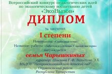 Семья Чарышкиных участвовала в Всероссийском конкурсе по экологическому воспитанию "ЭкоВызов" и стала победителем в номинации "Свободная тема" с работой "Заботимся о птицах. С папой мастерю". Семья награждена дипломом I степени.