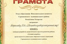 Воспитатель Карамова Ф.И стала призером муниципального конкурса разработок дидактического средства развития ребенка "Лучший ковробук"./Тәрбияче Карамова Ф.И район бәйгесендә катнашып грамотага ия булды.