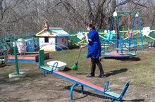 В рамках санитарного двухмесячника, сотрудники детского сада убирают территорию.// Бакча хезмэткэрлэре, санитар икеайлык кысаларында, эйлэнэ- тирэне чистарта. 16.04.2021