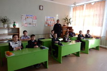 Мәктәптә өлкән дәүләт инспекторы Ахатов Фәнис Фирдәвисович белән очрашу булды. Ул башлангыч класс укучыларына юл йөрү кагыйдәләрен аңлатты. Барлык бала да отражатель- яктырткыч тагып йөрергә тиеш икәнлеген аңлатты.