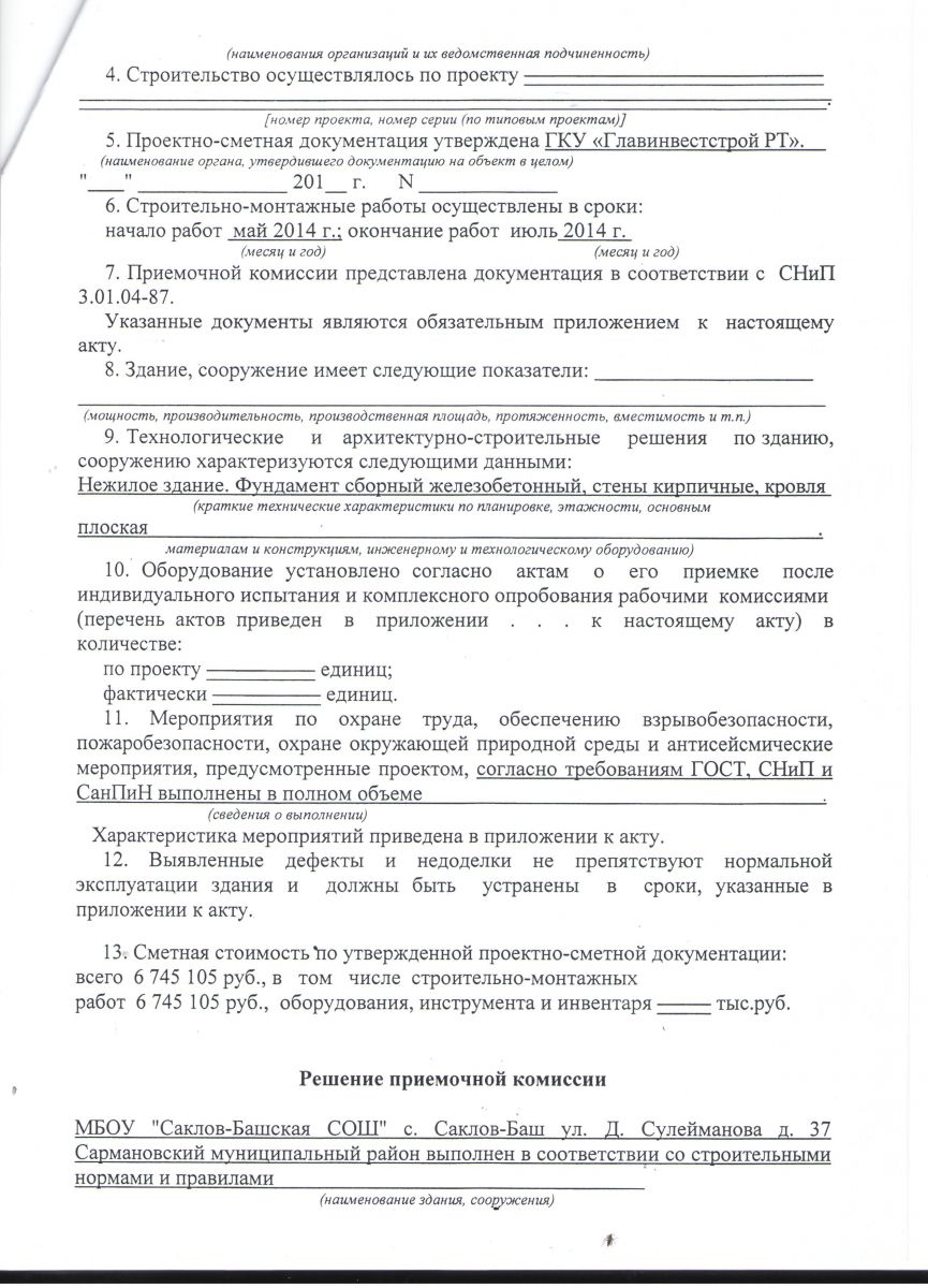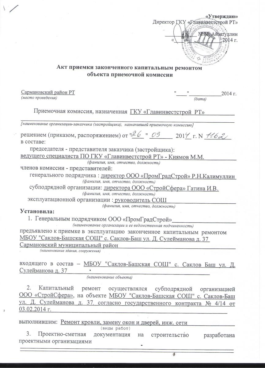 Акт приемки законченного капитальным ремонтом объекта