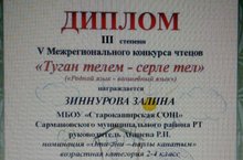 "Туган телем - серле тел" регионара шигырь укучылар конкурсында укучыбыз Зинннурова З. 3 нче дәрәҗәдәге дипломга лаек булды.